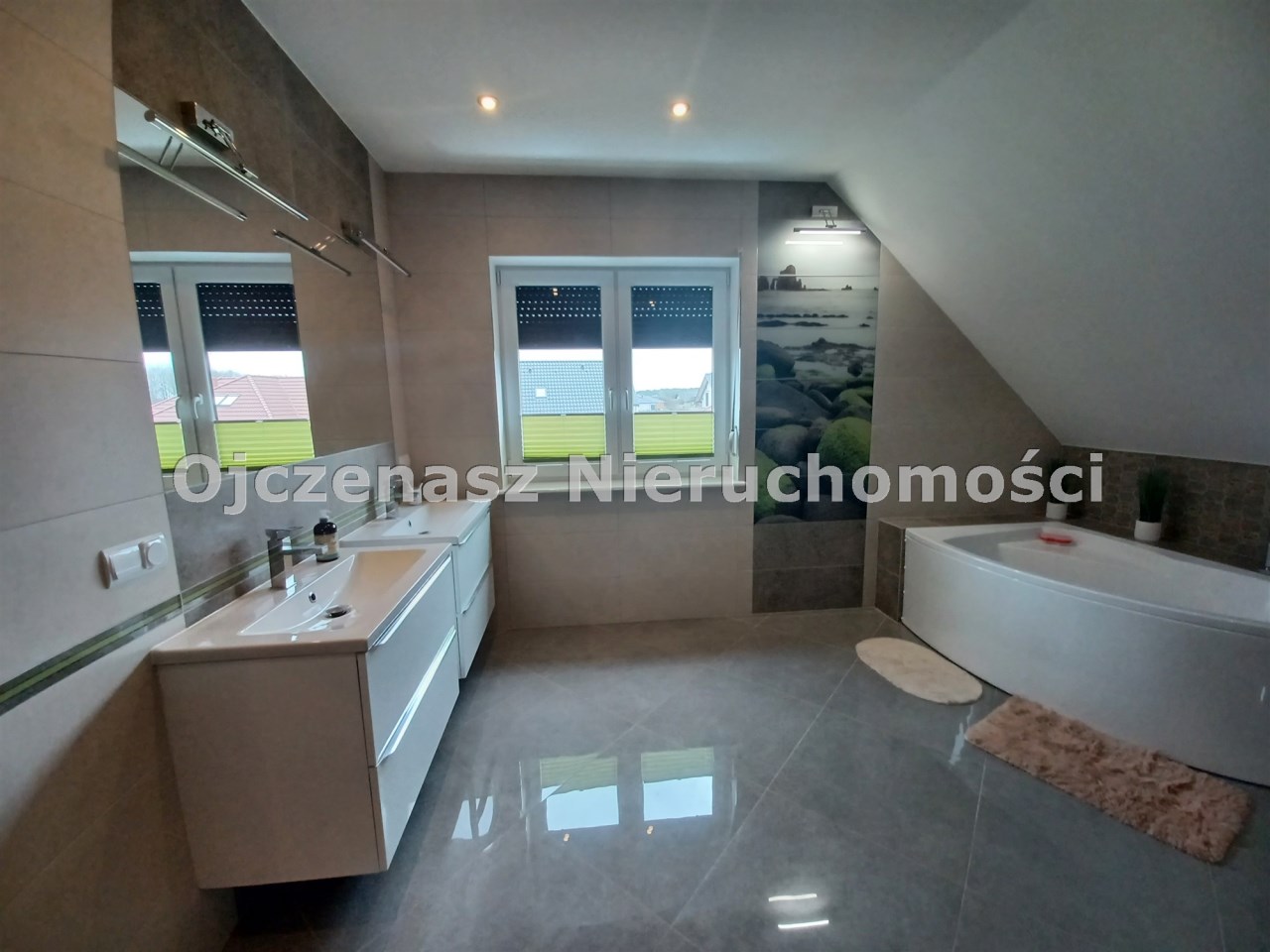 Pokój kąpielowy z oknem, dwiema umywalkami, wanną oraz dużą kabiną prysznicową.