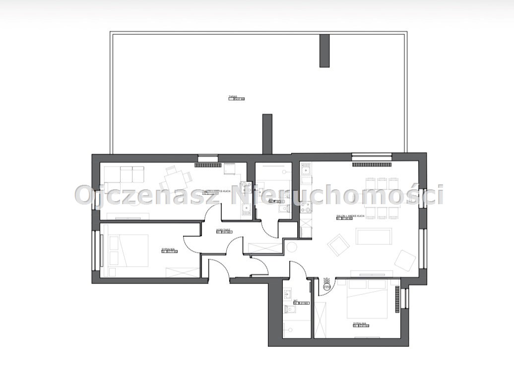 Ogromnym atutem nieruchomości jest bardzo duży taras o powierzchni aż 80 m², zapewniający dodatkową przestrzeń do wypoczynku, spotkań oraz aranżacji zielonej strefy relaksu.