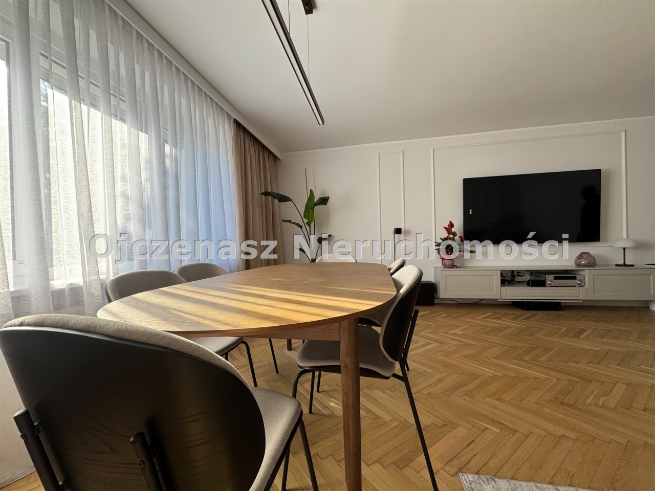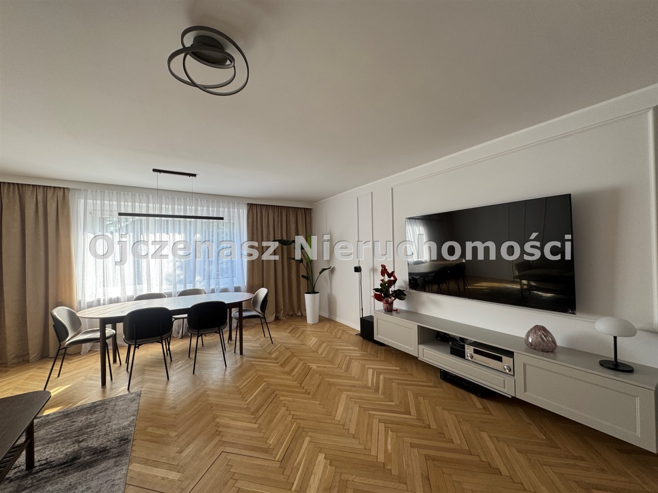 Parter: przestronny salon z TV 75”, kinem domowym, dużym stołem oraz narożnikiem z funkcją spania.